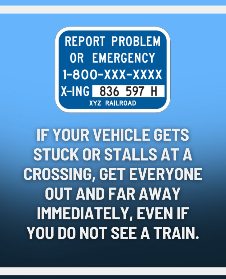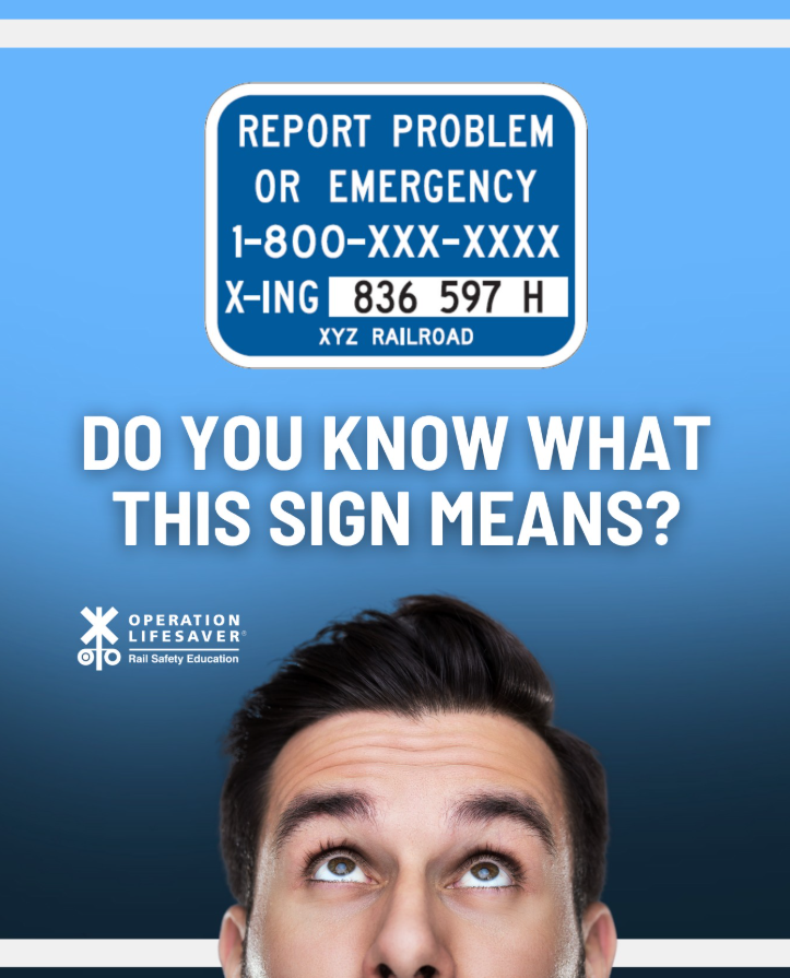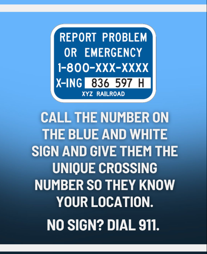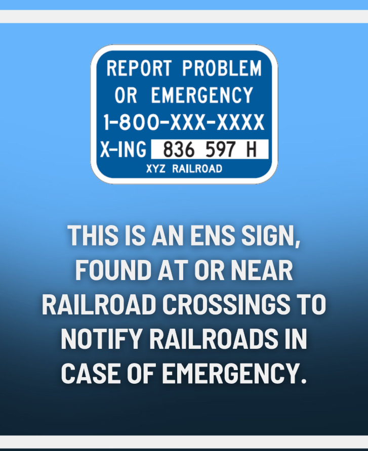 ENS Sign Awareness Day is dedicated to helping the public and first responders recognize and understand the vital role of the Blue and White signs posted at railroad crossings. These signs provide a phone number and location information needed to quickly report emergencies or safety concerns around tracks and trains directly to the railroad.