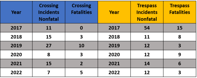 Section navigation Section Navigation State Sites Section Navigation About MS OL Free Railroad Investigation and Safety Course for First Responders (RISC) MS OL Events MS OL Safety Partners MS OL Statistics Contact UsKimbler SloanExecutive Director 601-594-4713 (mobile)ksloan@msoperationlifesaver.org P.O. Box 1624Jackson, MS 39215 MS OL StatisticsMississippi Rail Crossing and Trespass StatisticsSource: FRA Office of Safety Analysis